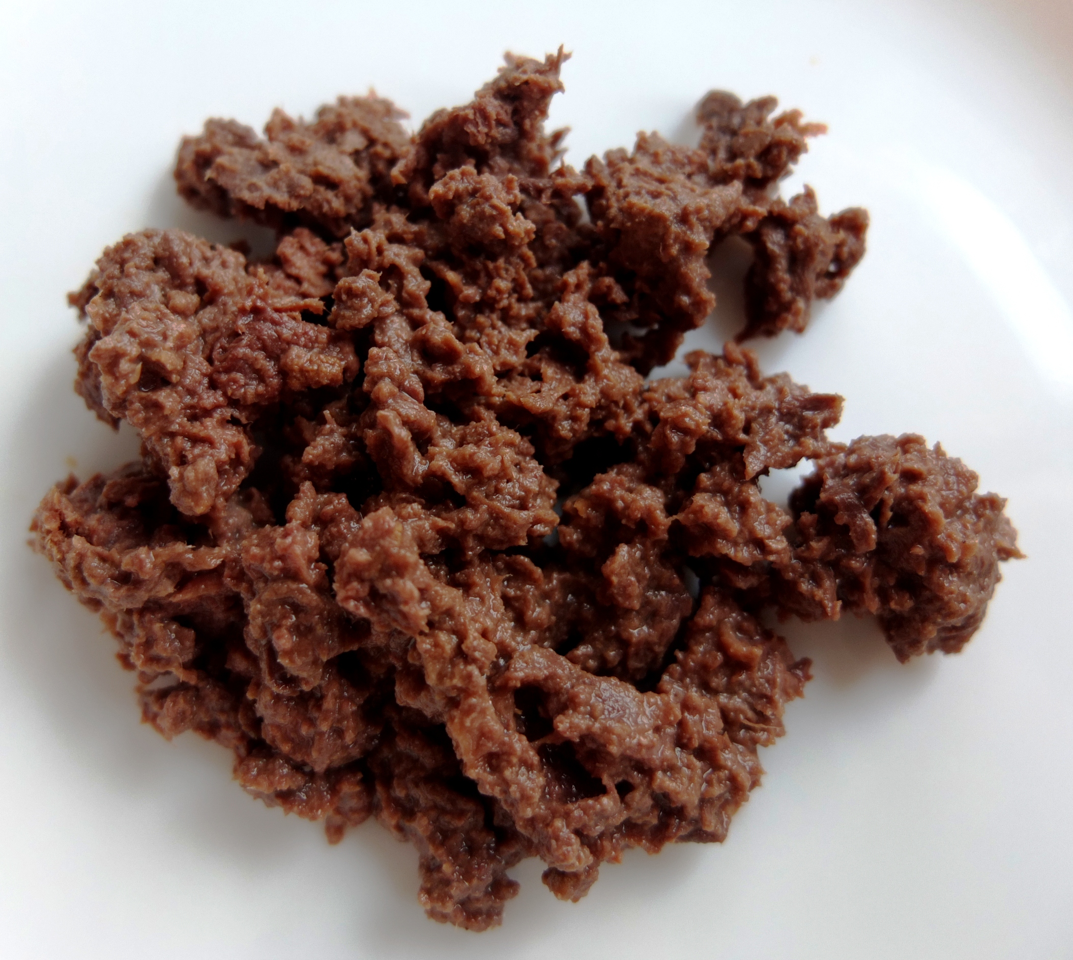 Skład (wołowina z kurczakiem):wołowina (35% płuca, serca, nerki, mięso, wymiona), kurczak (30%, wątróbka, mięso, żołądki, szyjki), węglan wapnia