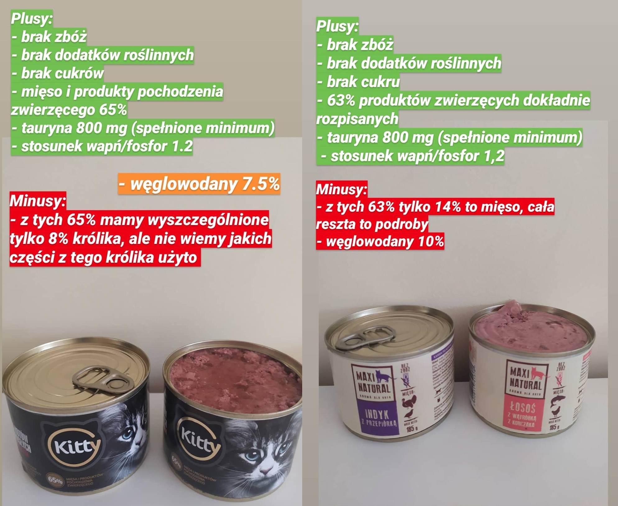 Dwie marki własne Biedronki. Kitty premium w czarnych puszkach jest gorsza składowo niż Maxi Natural, ale mimo wszystko obie karmy są na akceptowalnym poziomie.