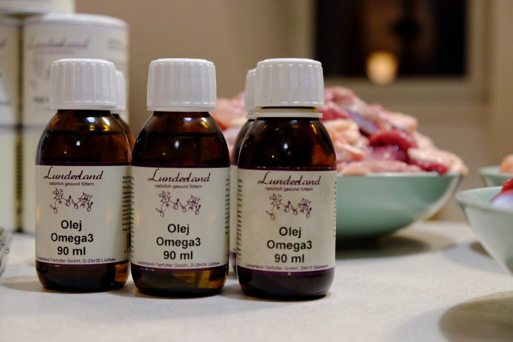 Przy karmieniu komercyjnym jedzeniem również suplementujemy olej Omega 3. Dlaczego dając dobrej jakości puszki, wciąż powinno się to robić? Ponieważ mięso z chowu przemysłowego nigdy nie ma tych samych parametrów co mięso pochodzące od wolno żyjących zwierząt. Tym samym ilość kwasów Omega występujących w takim mięsie ulega zmniejszeniu. Niejednokrotnie zdarza się też, że w puszkach wykorzystywane są oleje roślinne, albo istnieje informacja o zawartości oleju z łososia, jednak bez podania parametrów EPA i DHA.