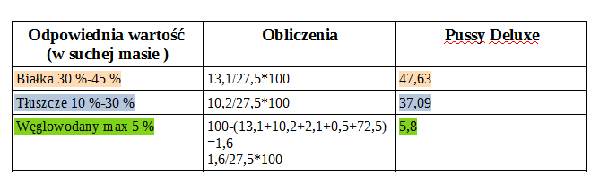 Pussy Deluxe jest pełnowartościowym pokarmem dla kotów. W składzie oprócz mięsa znajdują się oleje: z łososia i kryla i naturalne suplementy takie jak spirulina, sproszkowane skrupki jaj czy drożdze wykorzystywane w diecie BARF.